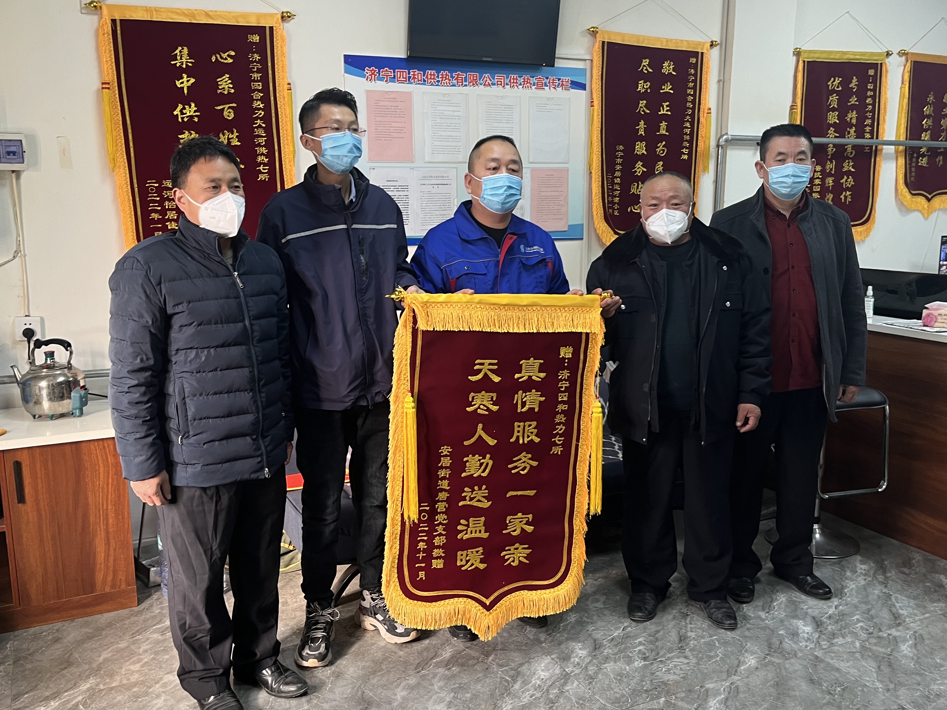 12月8日,胡營(yíng)回遷一期、胡營(yíng)回遷二期運(yùn)河灣、胡營(yíng)運(yùn)河怡居佳苑三個(gè)小區(qū)的業(yè)委會(huì)代表以及胡營(yíng)回遷一期唐營(yíng)黨支部領(lǐng)導(dǎo)專(zhuān)程前往濟(jì)寧四和供熱有限公司供熱服務(wù)七所,將四面鮮紅的錦旗送到所長(zhǎng)劉延春手中,感謝始終奮戰(zhàn)在供熱一線的工作人員的辛勤付出。